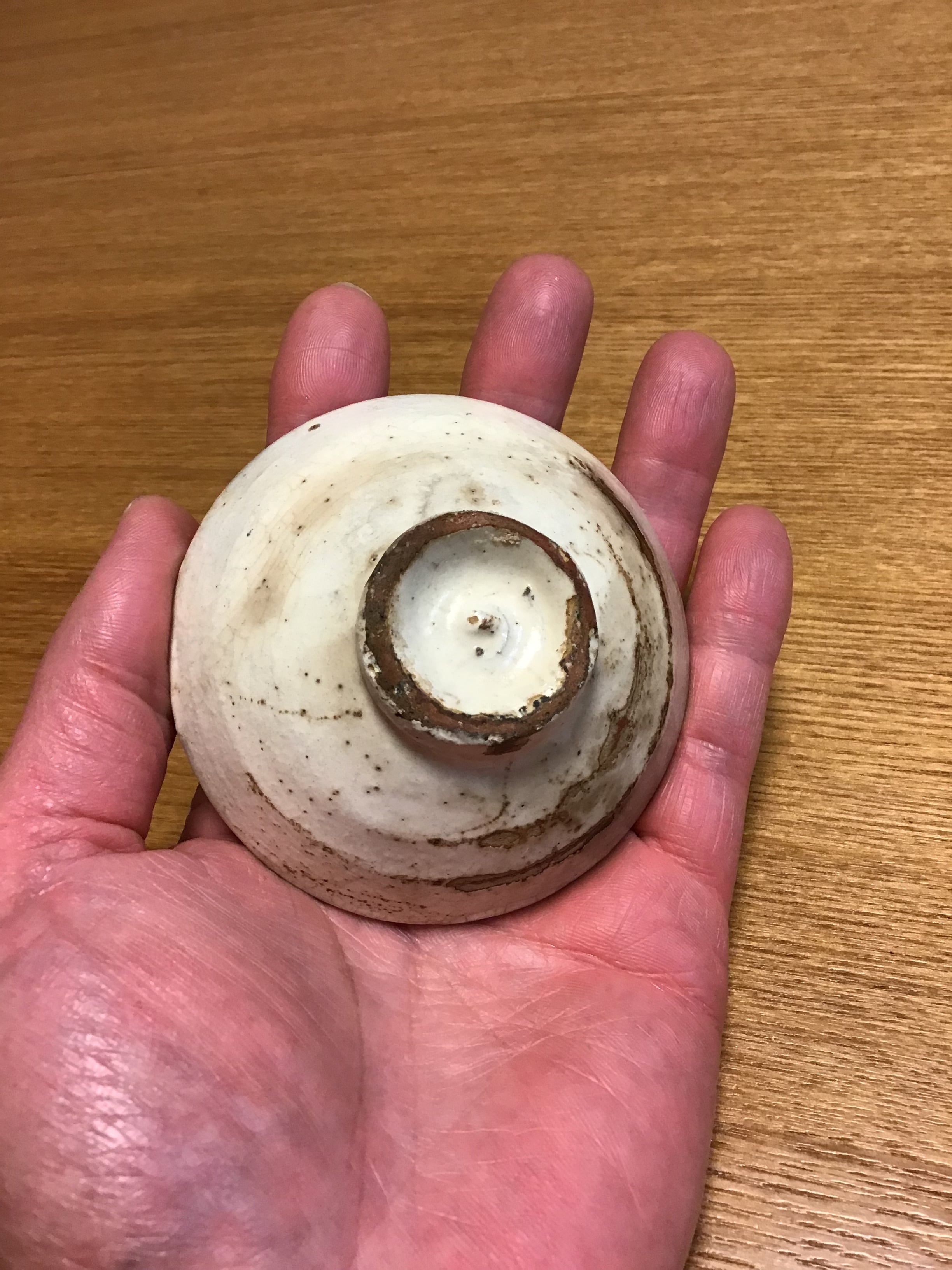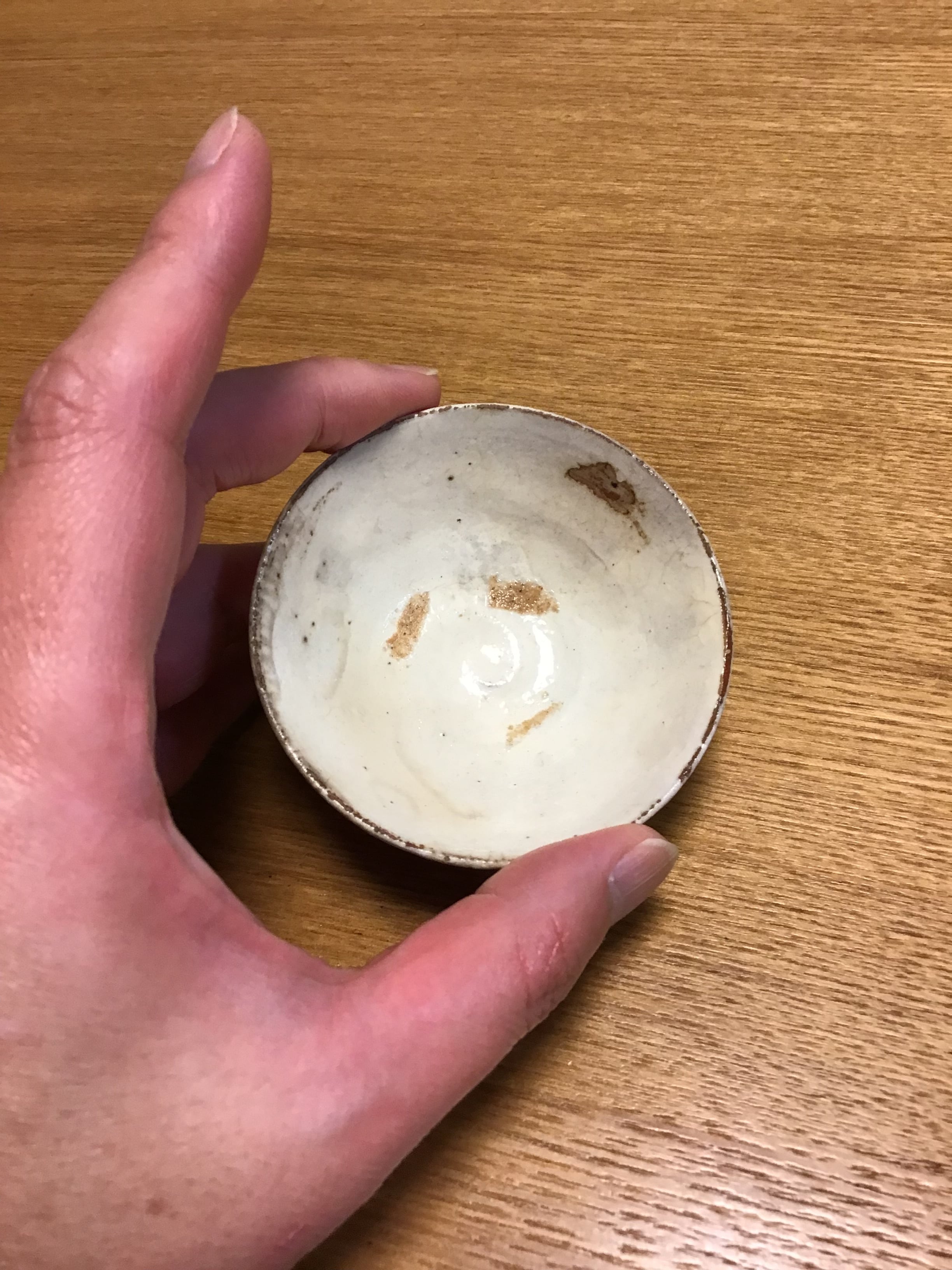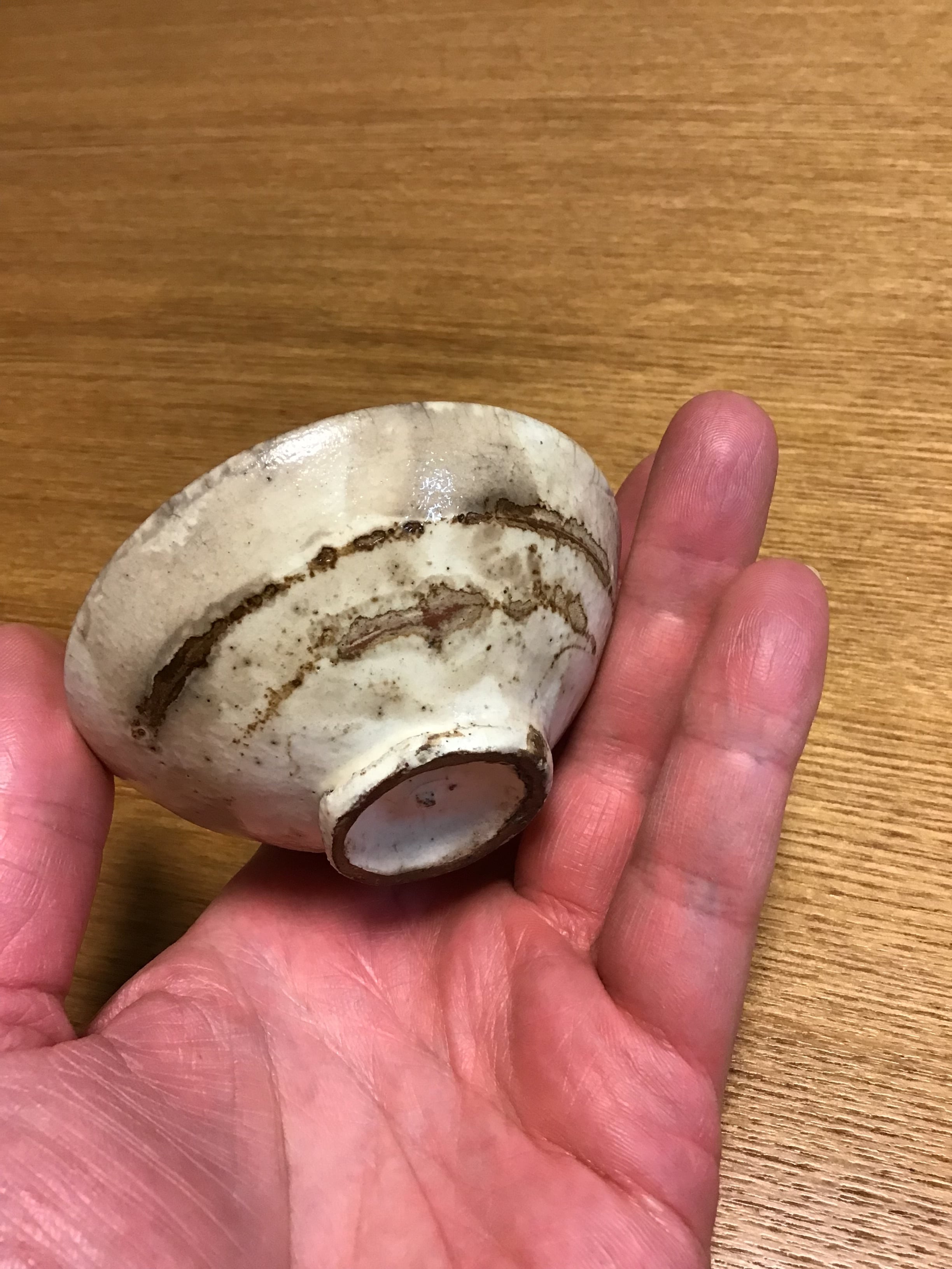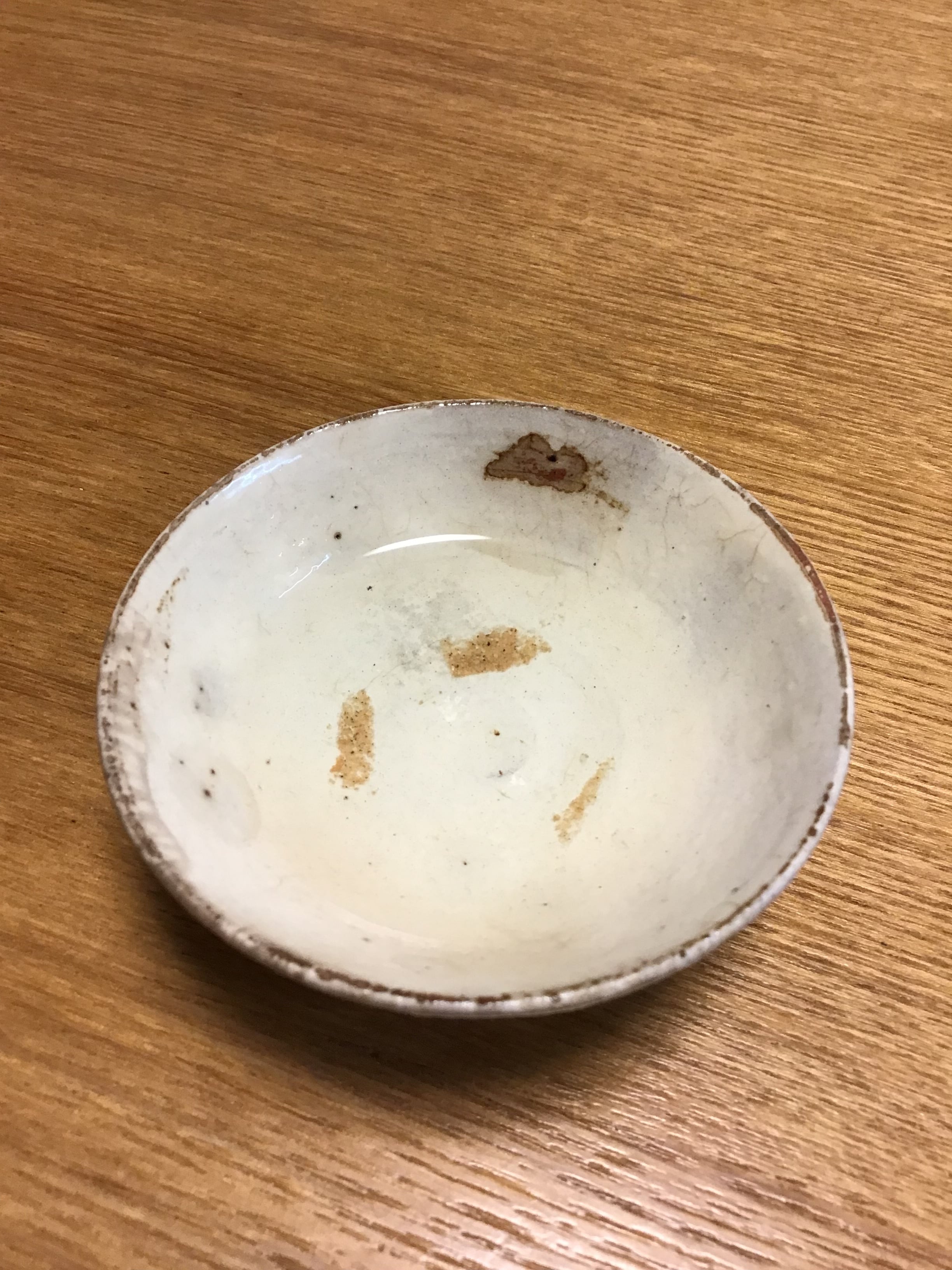 江戸時代後期、古伊万里のリン茶碗です。まるまるフワフワとした愛らしい牡丹紋が心和みます。見込みにもさり気無い草花紋が配され酒映りにも一味ございます。日本酒では大振りですが香り立ち吟醸酒など小量入れて飲むのがお薦めです。全体に綺麗な上がりです。高台の接点にくっつきにより剥がれた小さなホツレ有りザラつきがございます。ご了承下さいませ。 サイズ w8.3cm h5.5cm 質量117g 箱無し