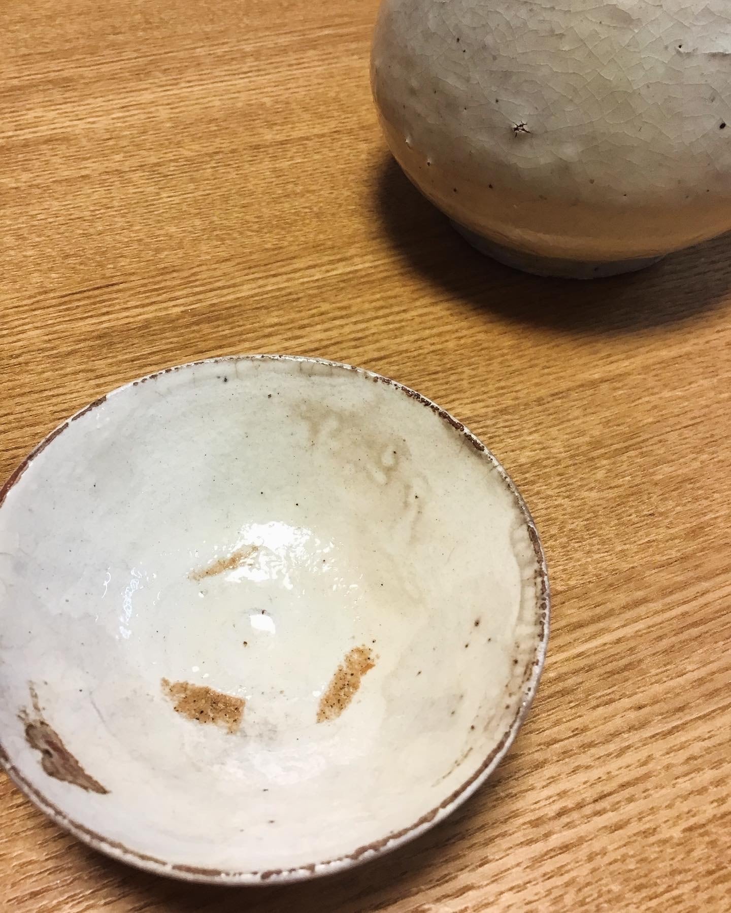 数年前に弊店にて個展を開催されて頂いた際の出展作品です。 掻き落としという技法が用いられ、全体に施された白化粧から版木を彫るように描かれる独特な技法となっております。朝鮮李朝時代にその本歌がございますが、紋様も様々です。 本作はそうした技法を駆使して縁起の良い双魚紋が施されるも、自然釉で隠れてしまい、 まるで流れに乗る魚にも見えます。反対側はヒラメが配され愛嬌もございます。 箱には特別に同じ双魚を描いて頂いています。 未使用/共箱付(共布しおり) w11.0-d9.8cm h12.7cm 質量413g 容量460cc 約2合半