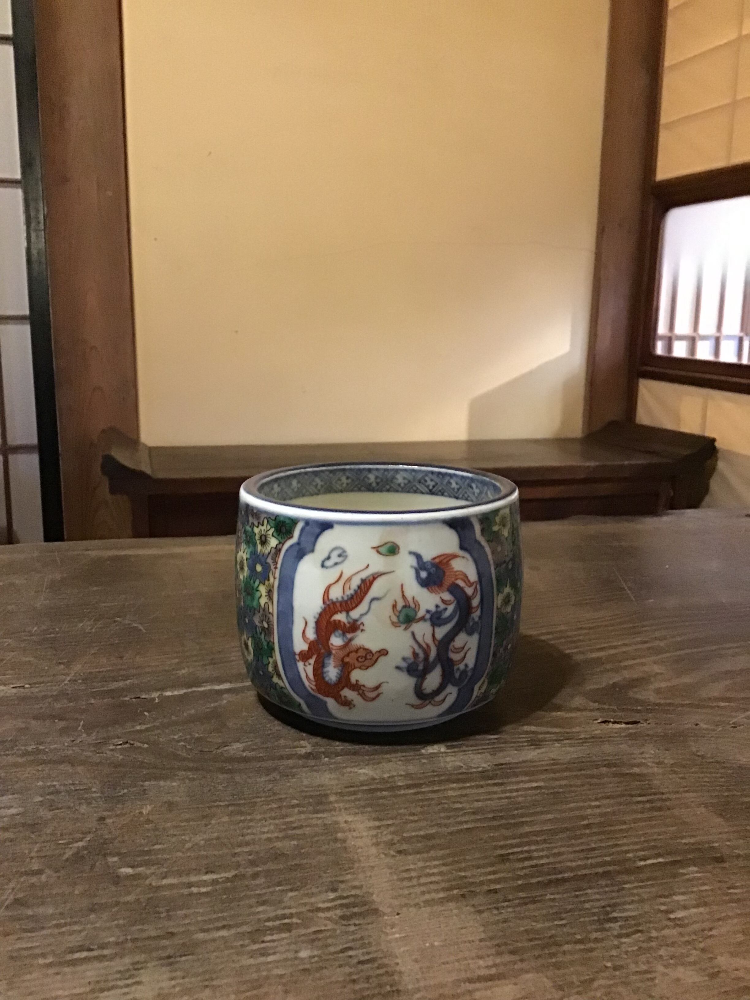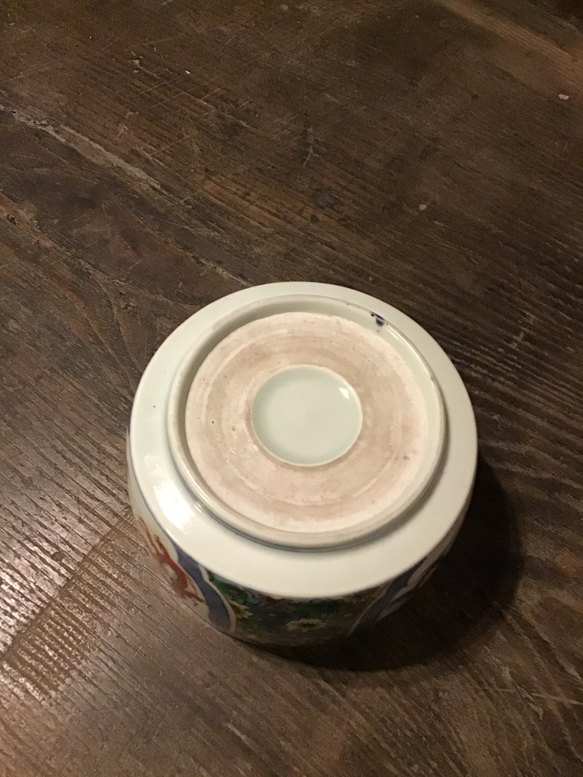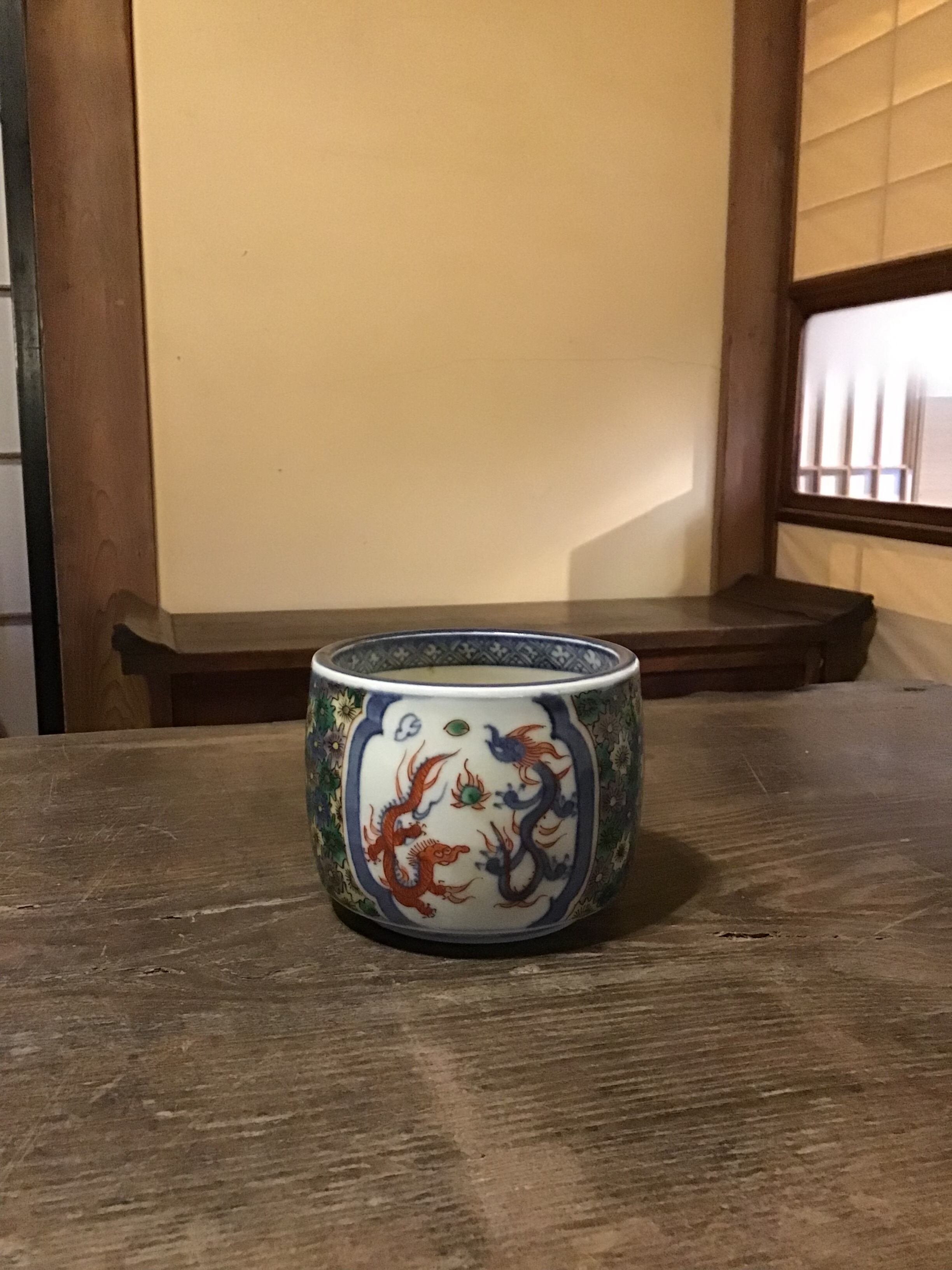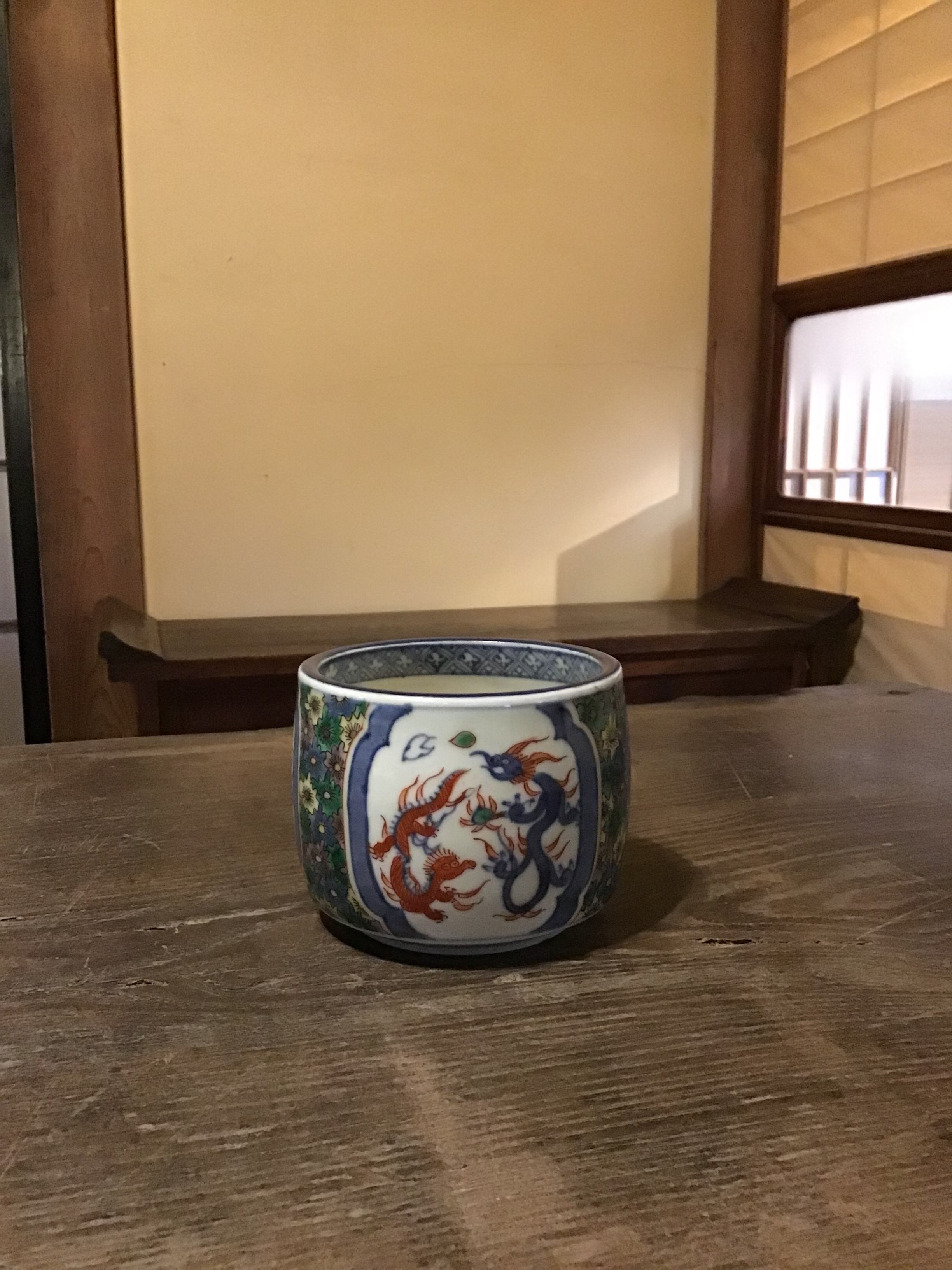 江戸時代末期の古伊万里です。大振りな香炉です。やや胴部に膨らみを持たせた太鼓形。煙草盆に入れるキセルの火種入れ・灰落としかもしれません。三方の窓に配された赤と青の双龍紋、今年は辰年、灰を入れてお好みのお香を愉しんではいかがでしょうか。ほとんど使用感を感じさせない物で上がりも上々です。