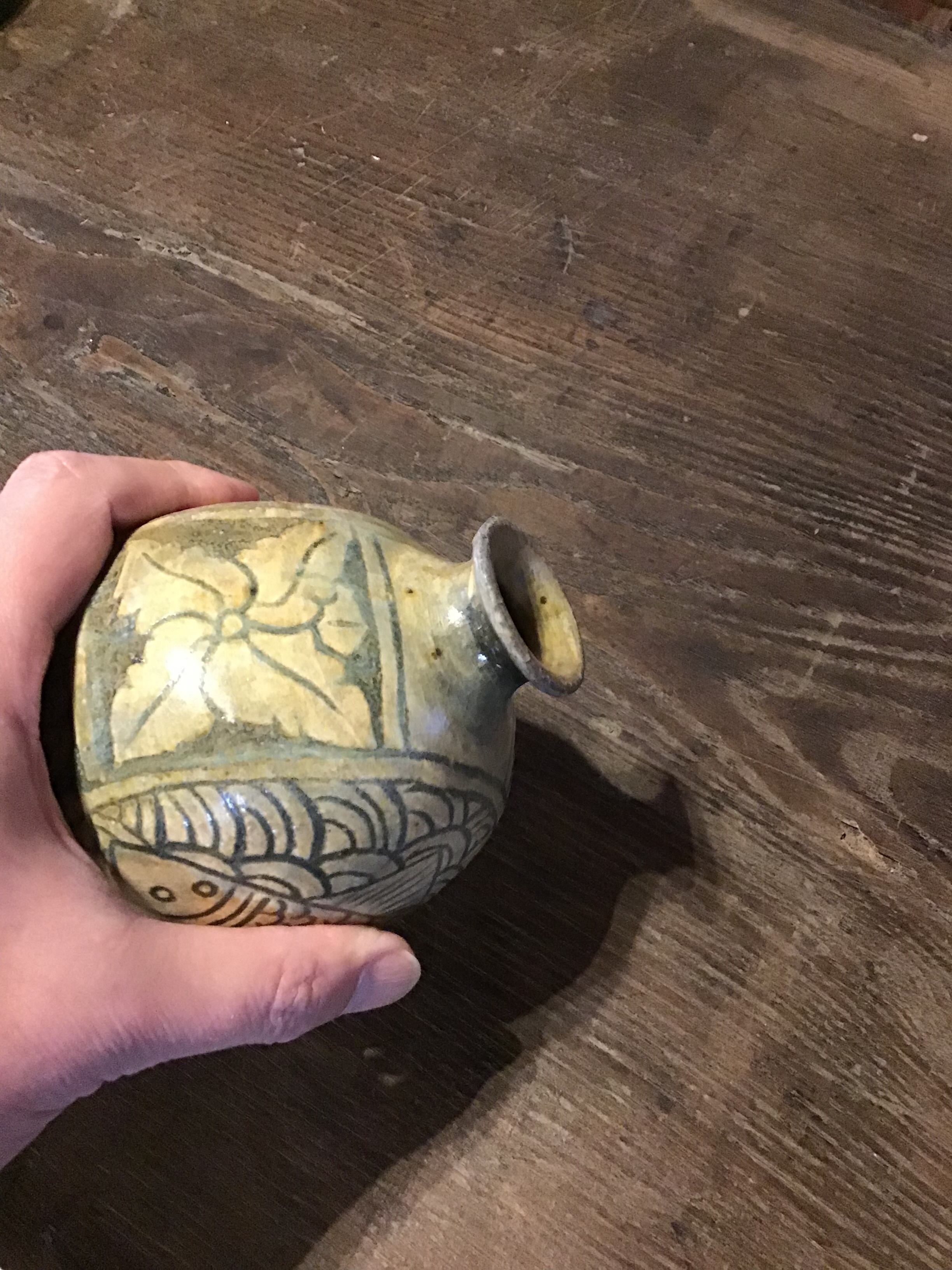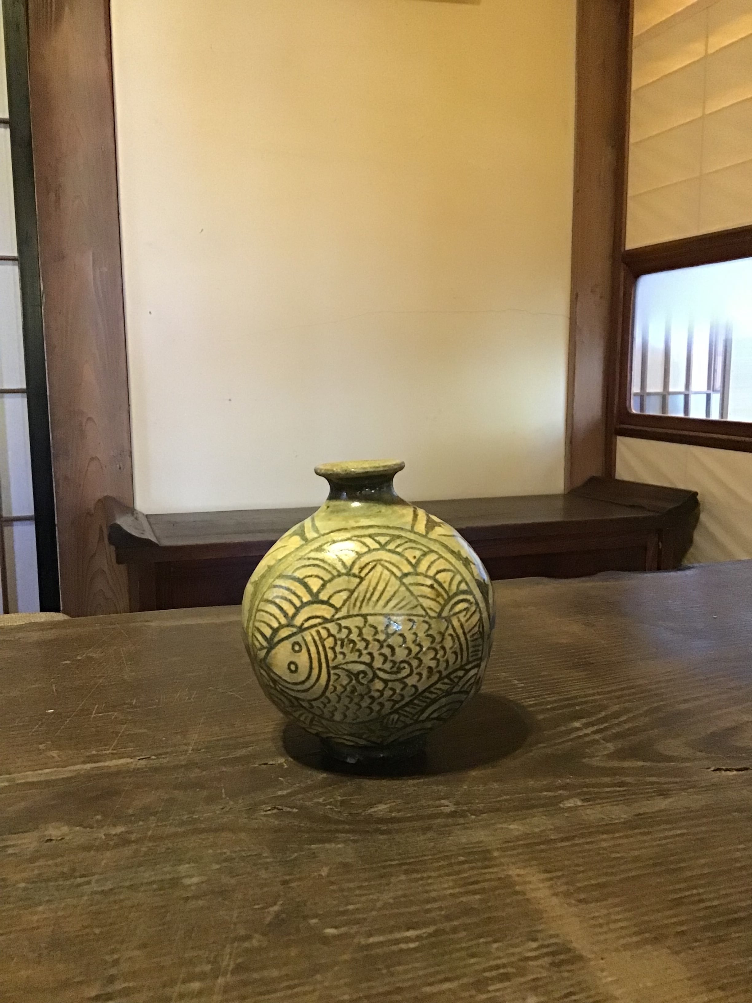 本作はそうした技法を駆使して縁起の良い双魚紋が施されるも、自然釉で隠れてしまい、
