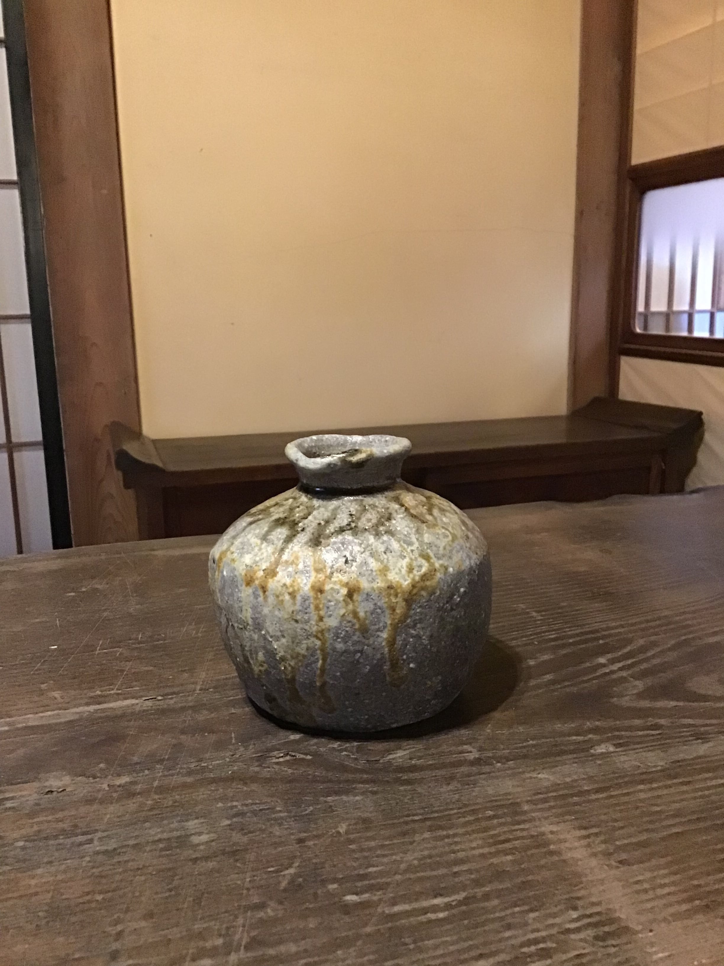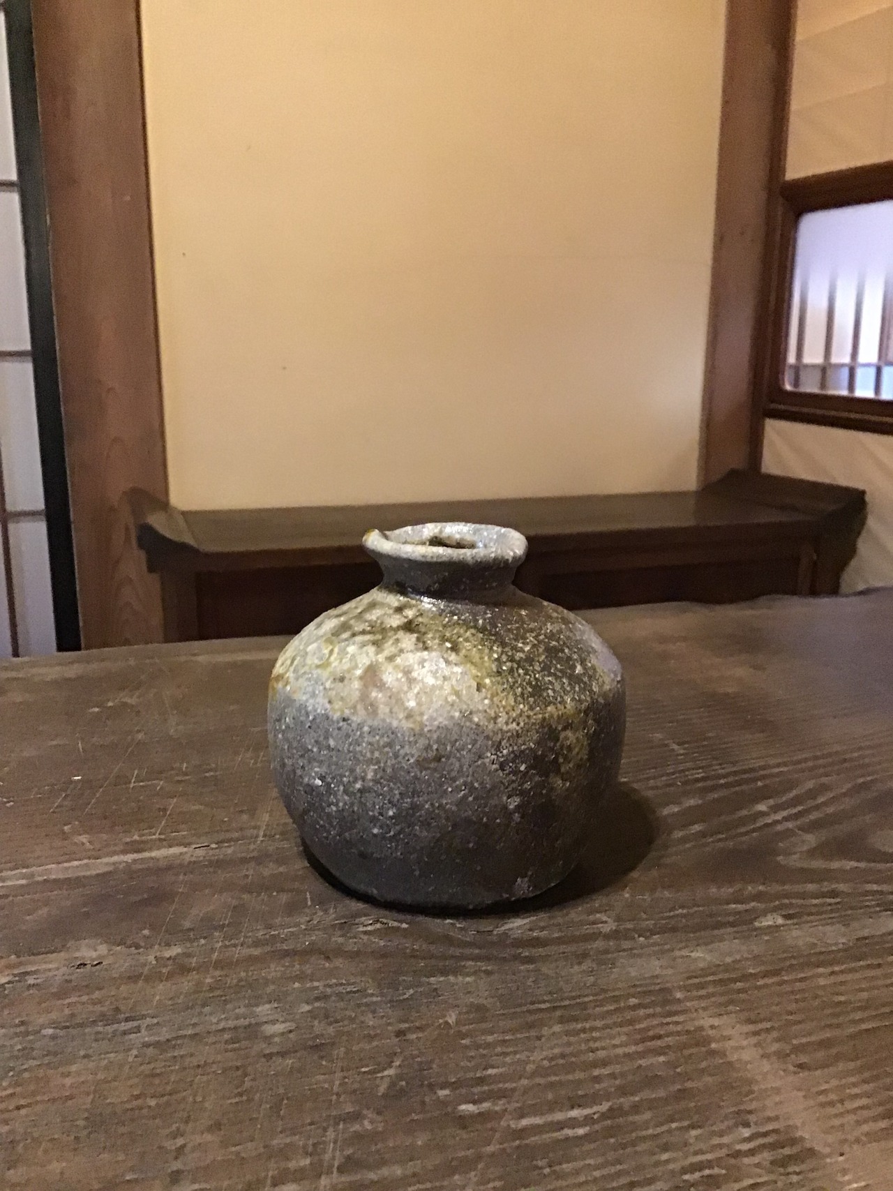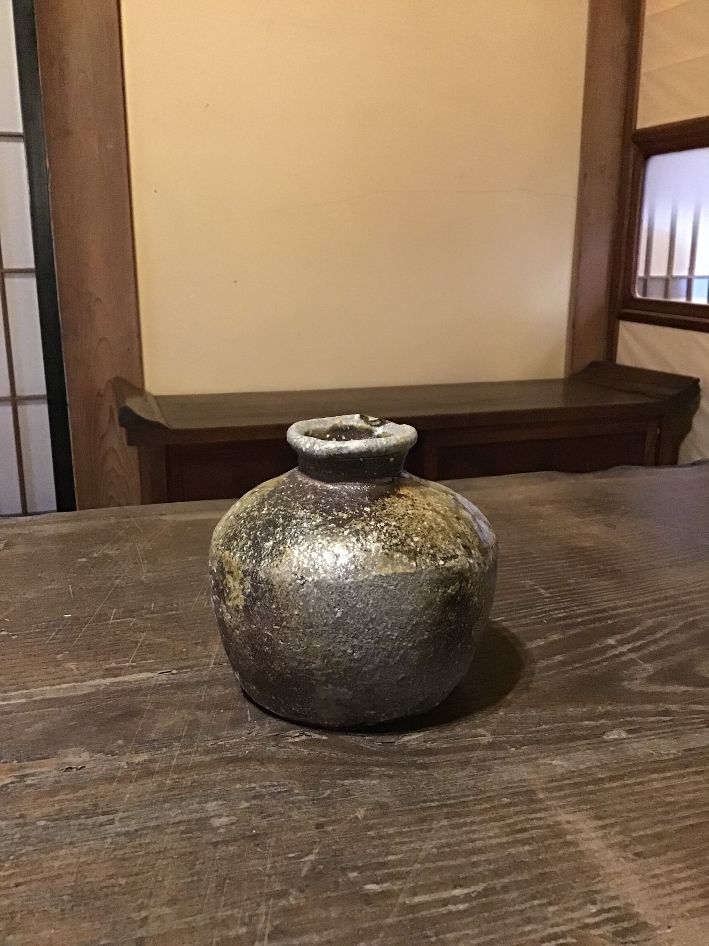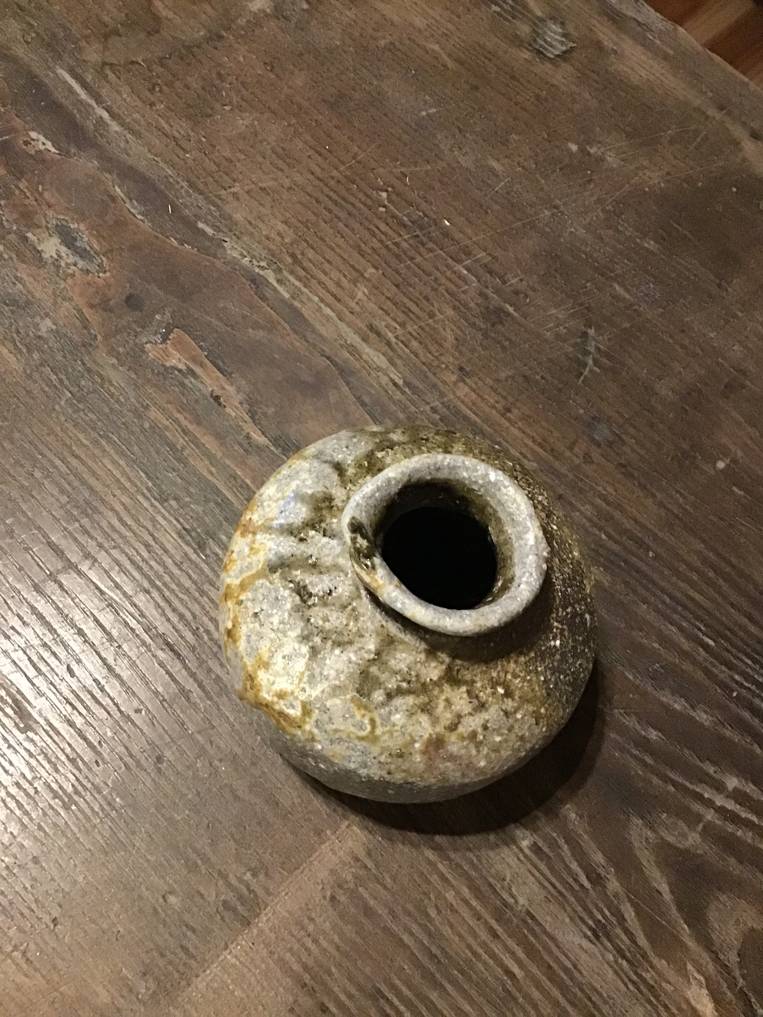 北海道出身で唐津で修行されたのち、越前の地で作陶され惜しまれながらも逝去され陶芸人生を閉じられた三好先生の作品です。山土は自ら野に分け入り、平安鎌倉の雰囲気を彷彿とさせる土味に拘りました。造形は紐作り、それによりラインがロクロでは出せない陰影を放っています。越前では口の付いたこの手の小壷を「おはぐろ壷」と呼んでおりますが、小さな口が付いた事で注器としても魅力的です。酒を満たせば二合半、酒壷としてもいかがでしょうか。