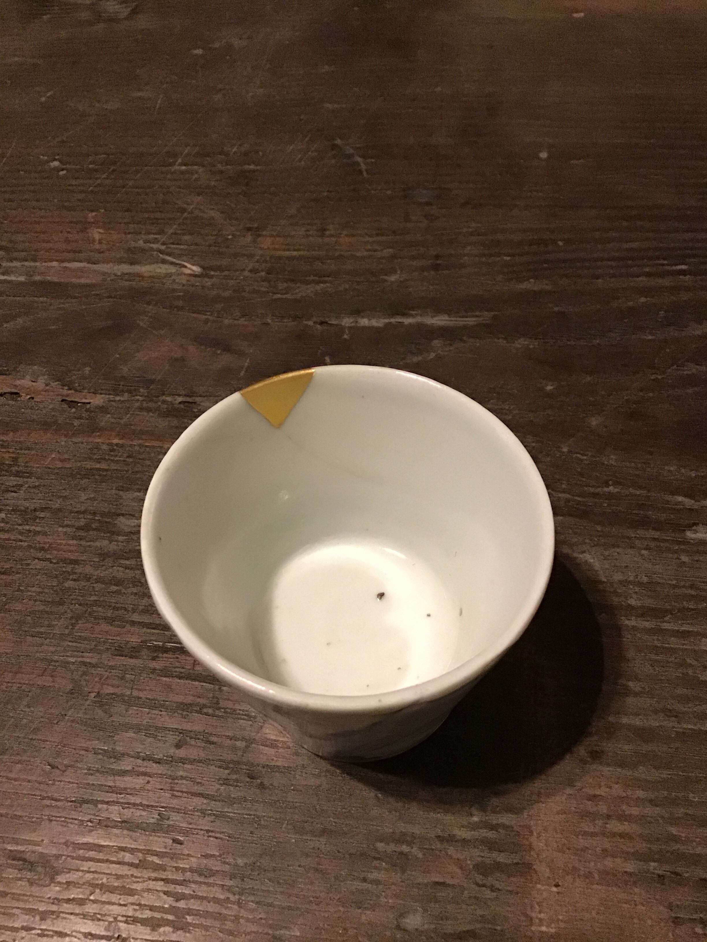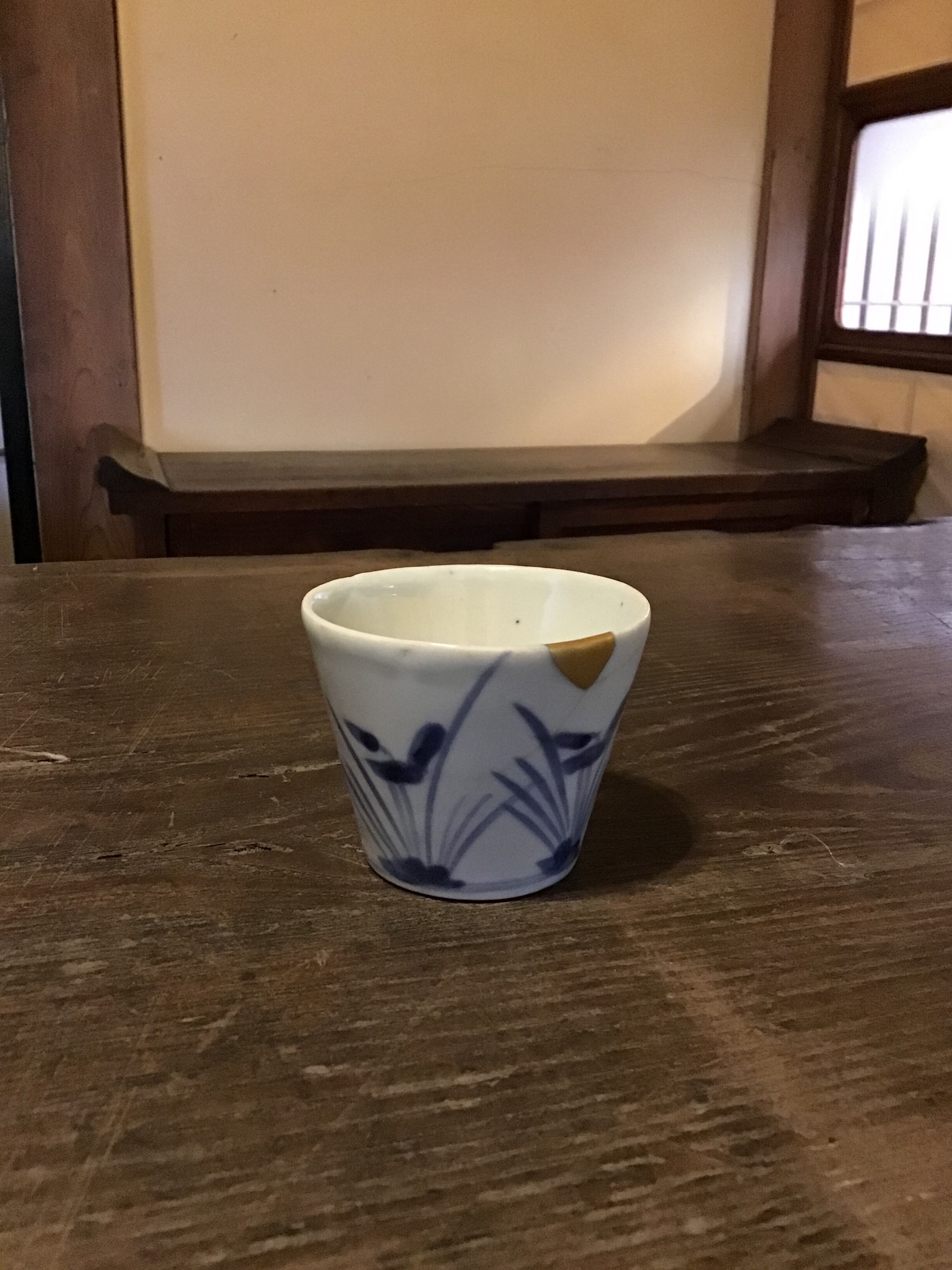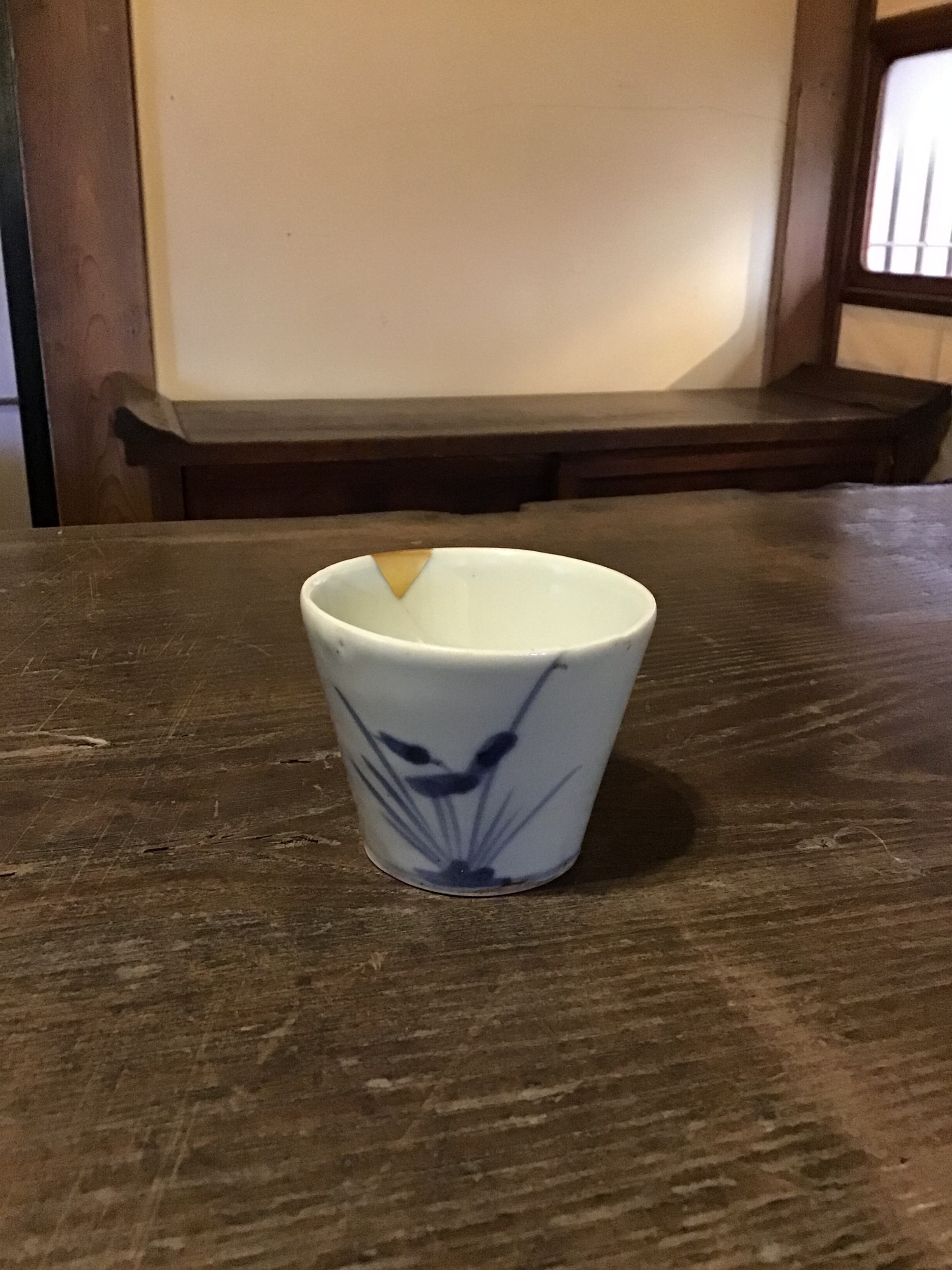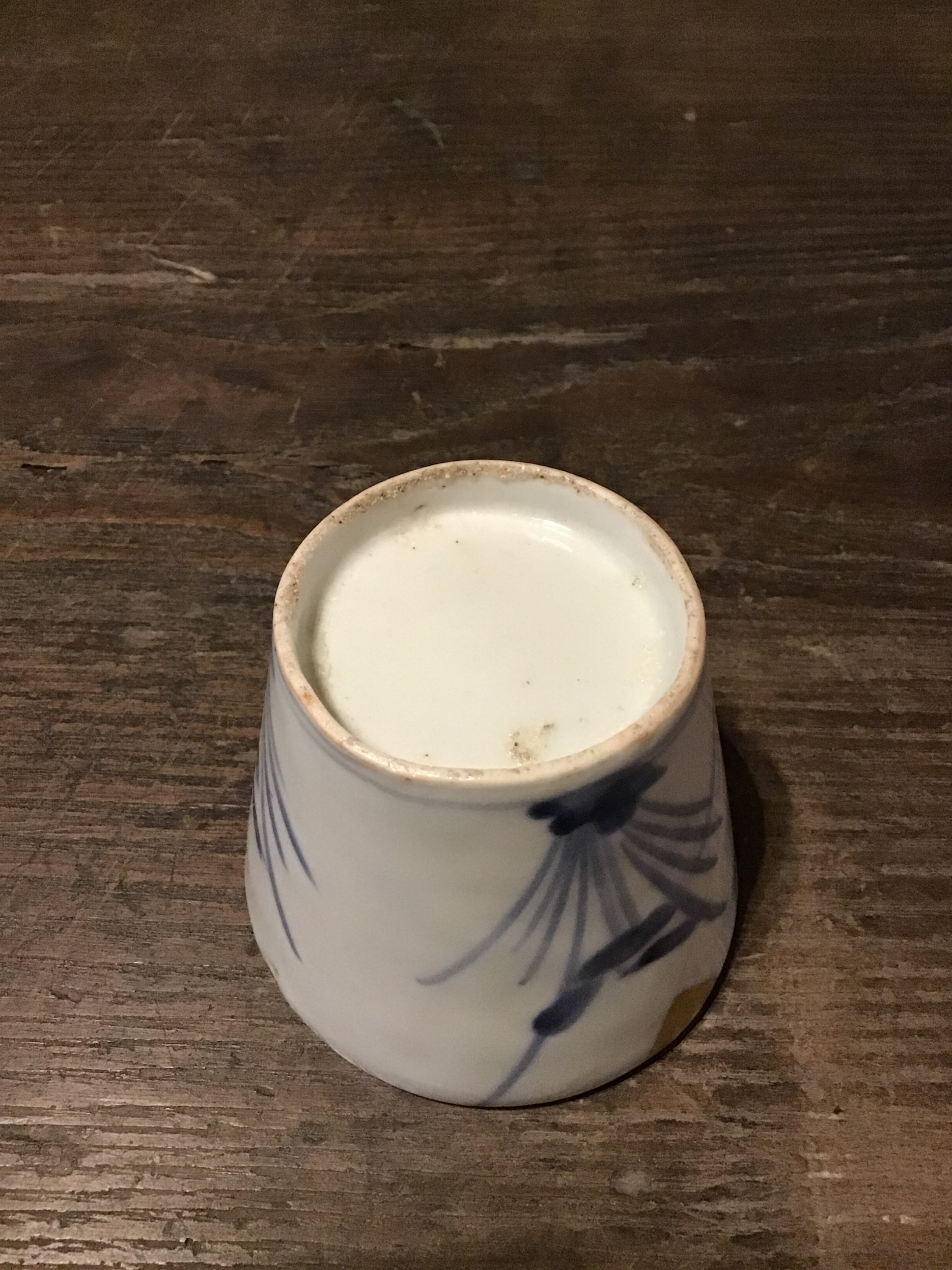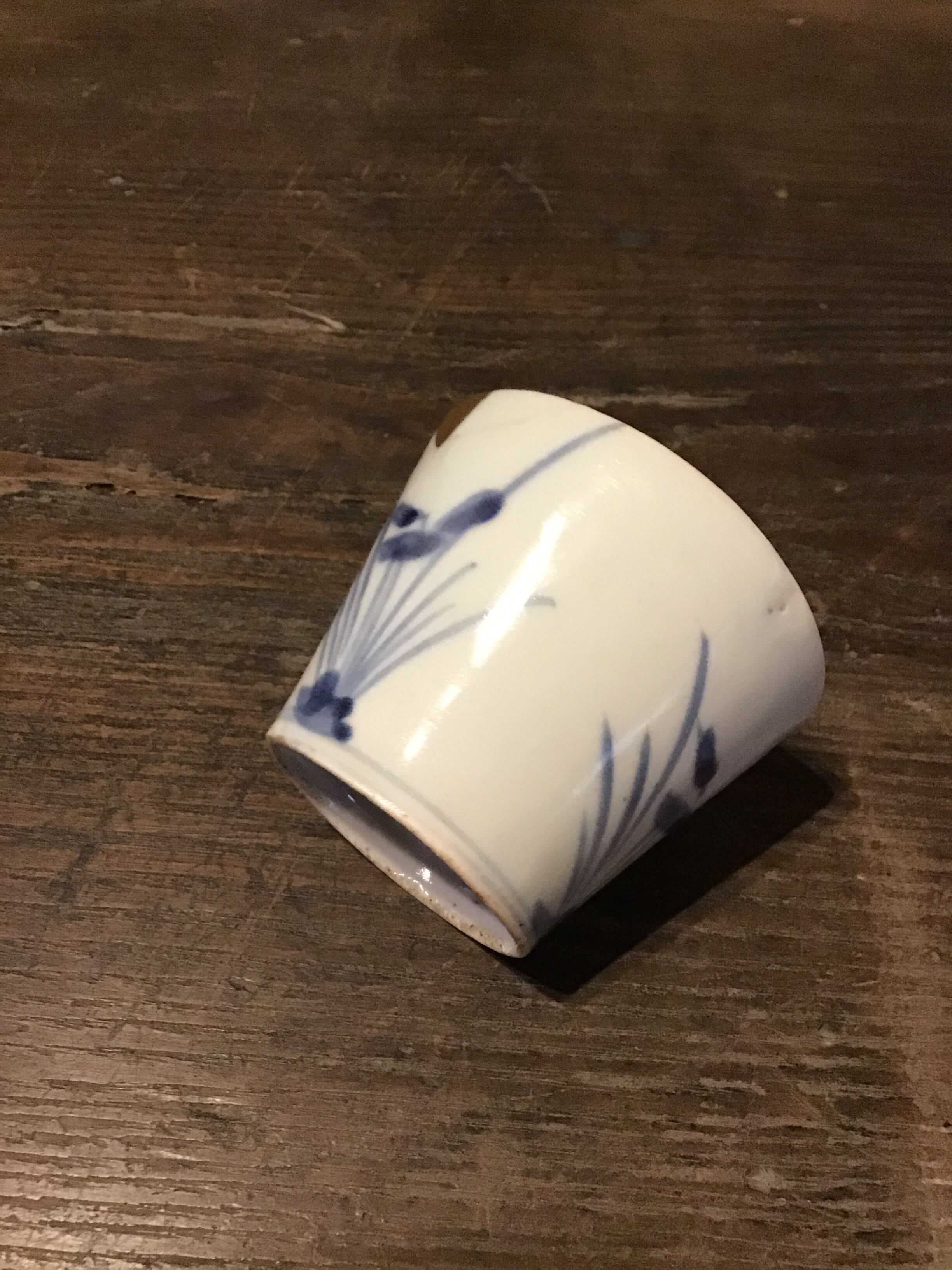 江戸時代前期1700年代初頭の古伊万里猪口です。砂の付着した上げ底高台で見込と底を同時に触ると分厚く重量が有ります。このサイズの一般的な猪口の重さは概ね80g程度ですが、これは113g。初期の猪口はずしりとした手取りが魅力です。生掛けのトロリとした釉薬に口縁まで勢いのある筆使いの草紋が前後に描かれています。口に綺麗な本金繕いがございます。酒呑に最適で日本酒が美味しそうな猪口です。