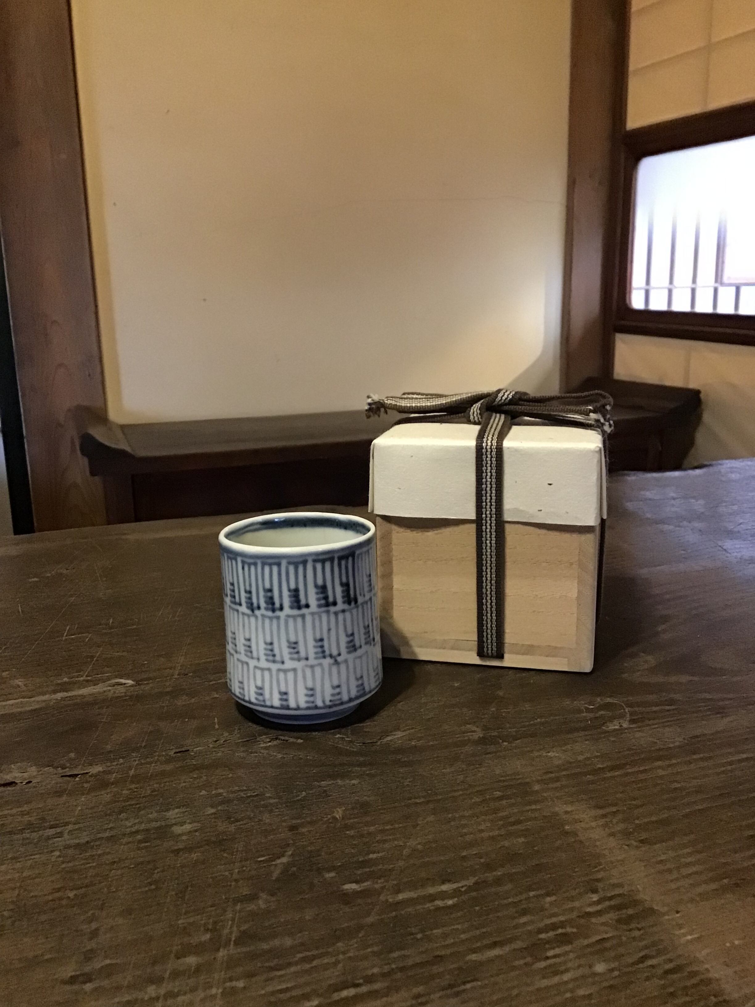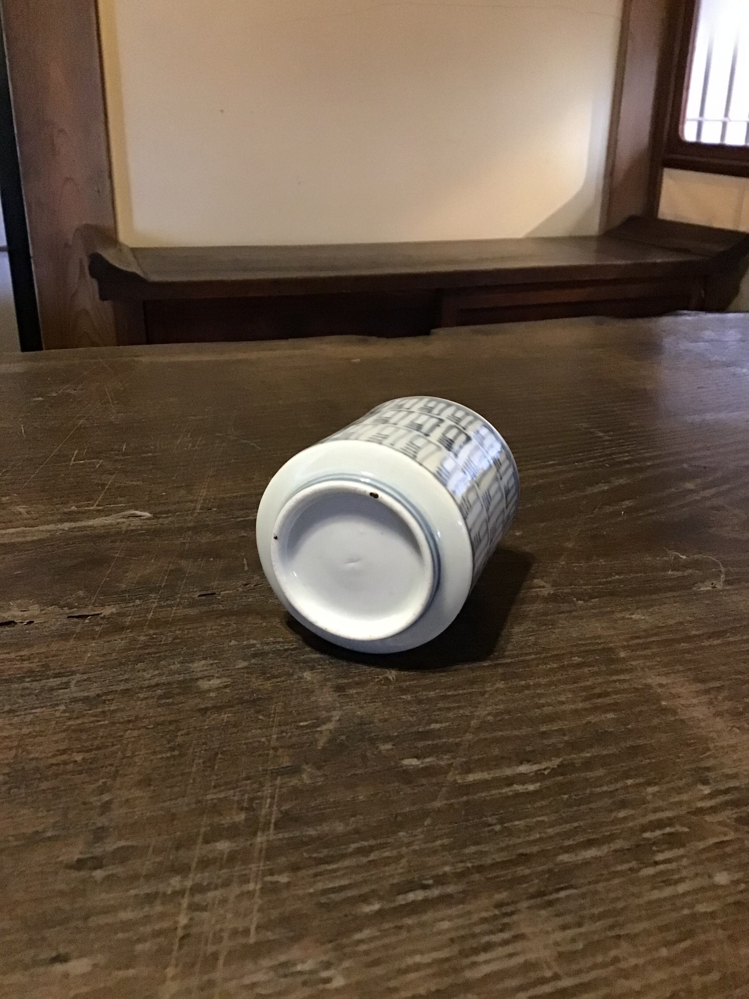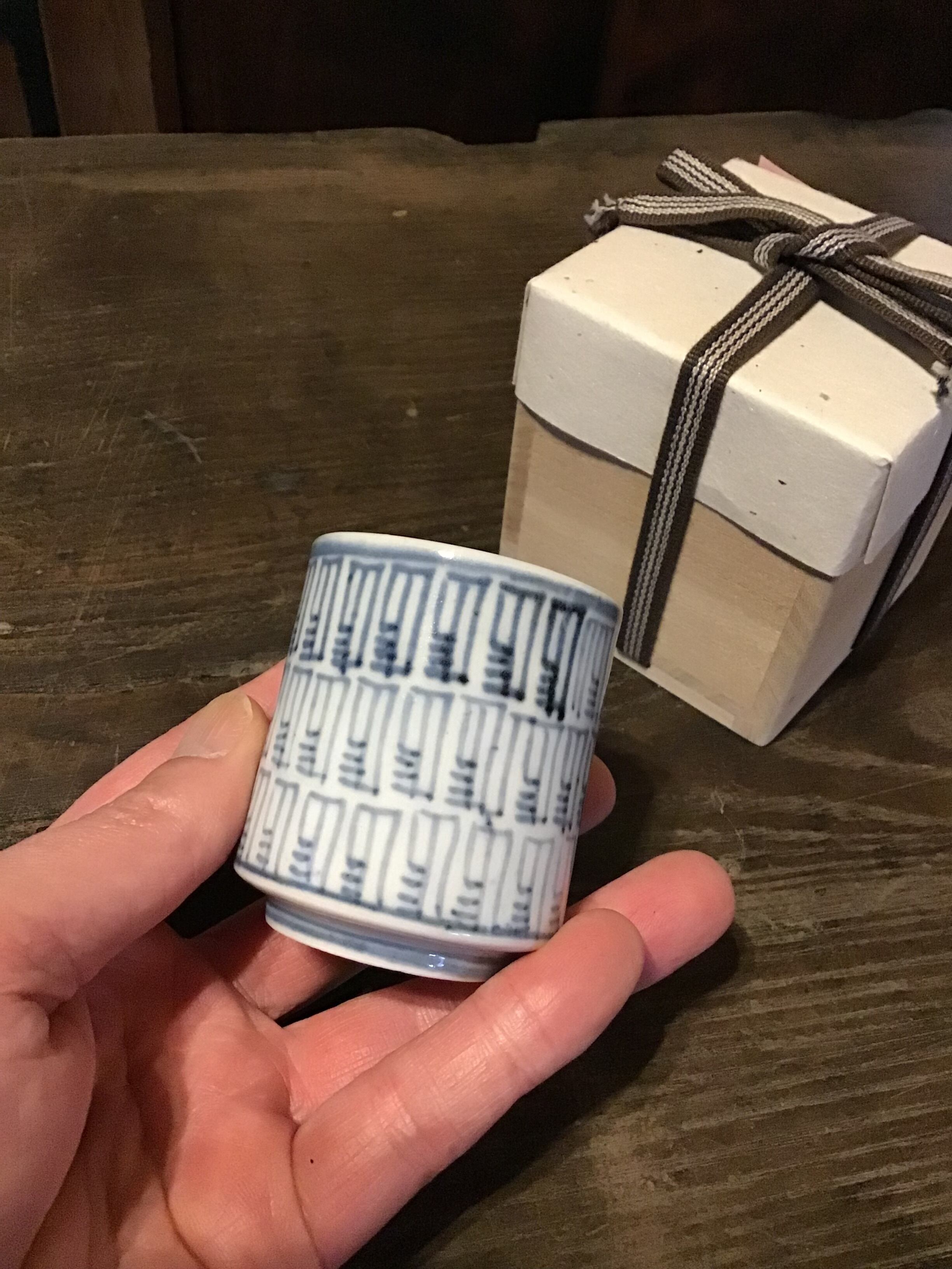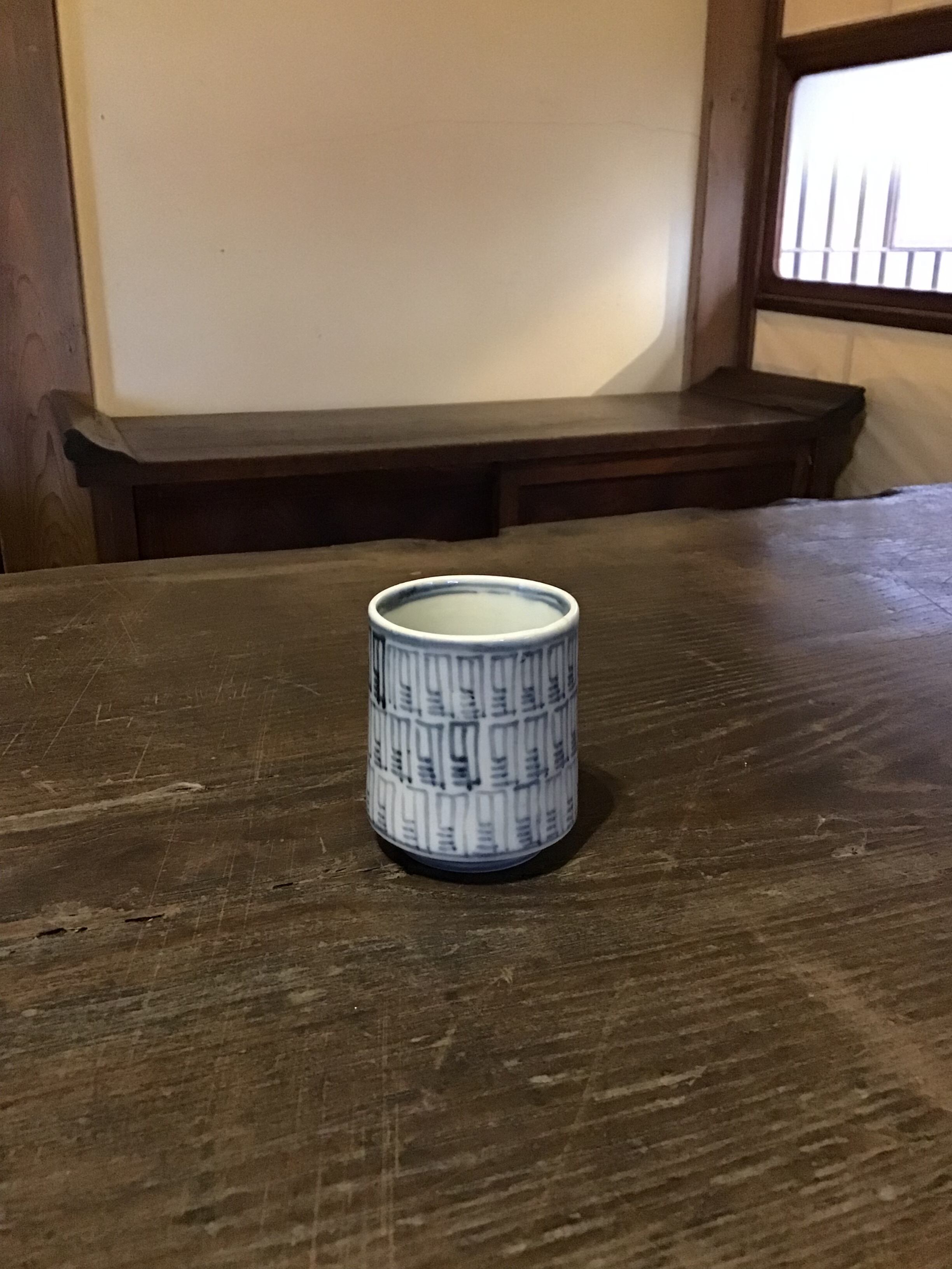 江戸時代後期の古伊万里の覗きです。大振りな手で蕎麦猪口並みの程よい重量感が魅力です。呉須の色も落ち着いていて上がりも上々です。一般的に暦紋と呼ばれる手ですが、梵字の連続紋とされサンスクリット語などが語源で仏教に通じるものです。見込みは梵字で「寿」を表します。キズは高台畳付きにくっつきの黒点、口縁からニュウが一つありますが、叩いた音は悪くありません。熱湯さえ入れなければ問題なく冷酒呑にも最適と言えるお品です。口が底部よりすぼまった形状です。最近あまり見かけなくなって来た暦紋の古伊万里酒器は貴重です。