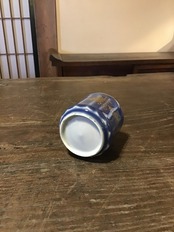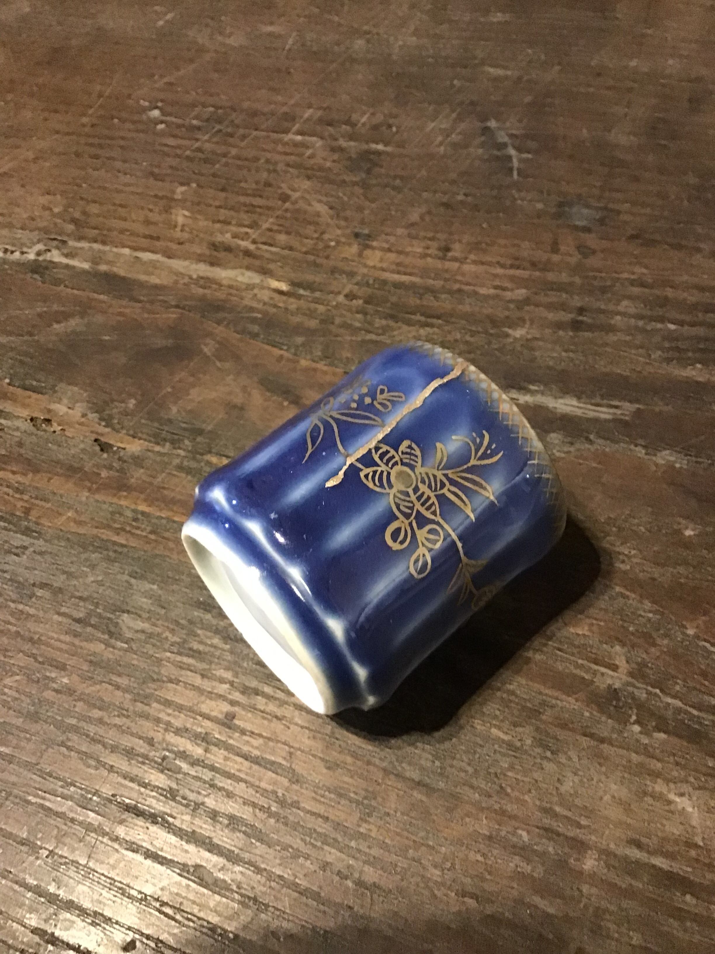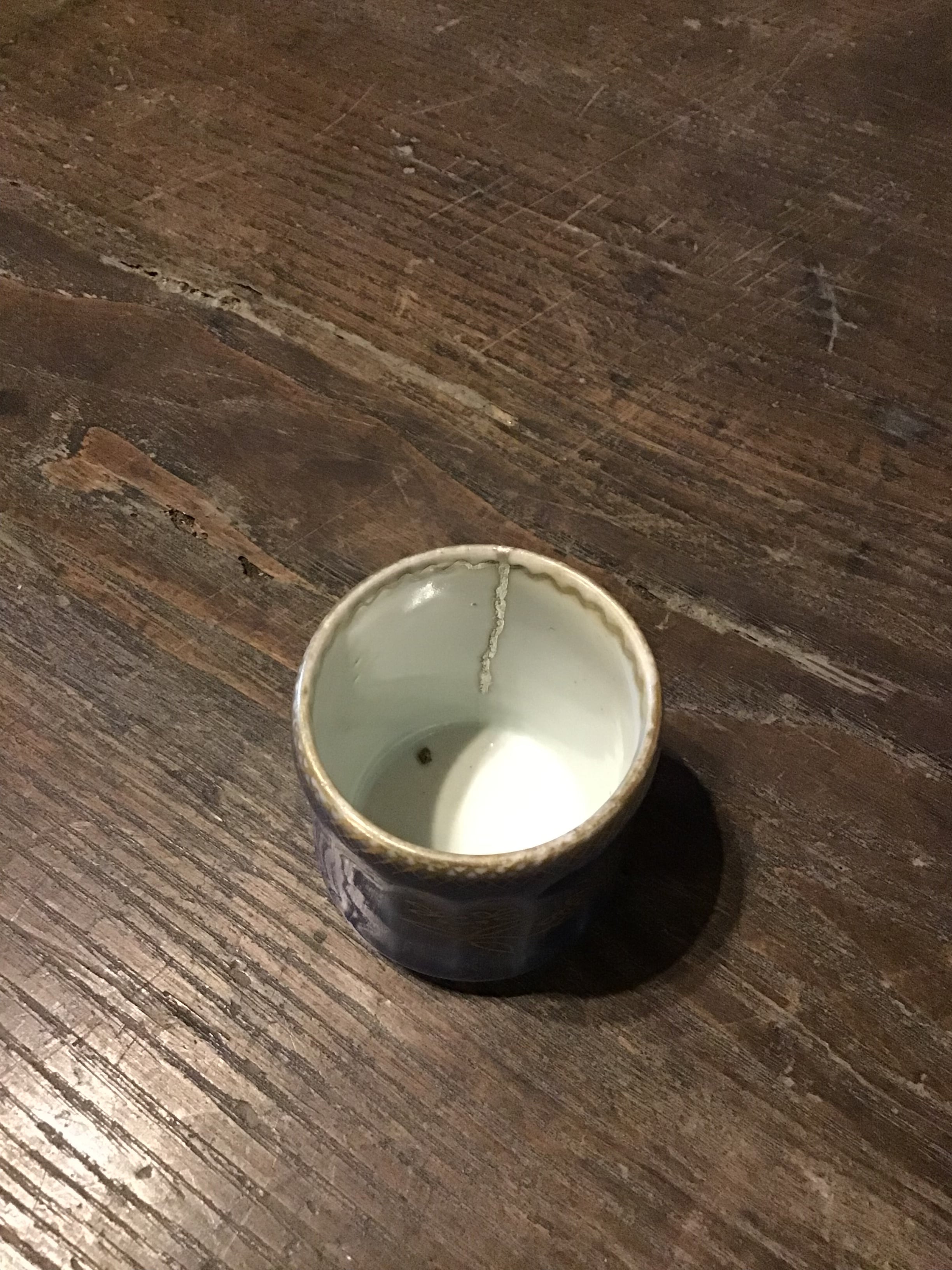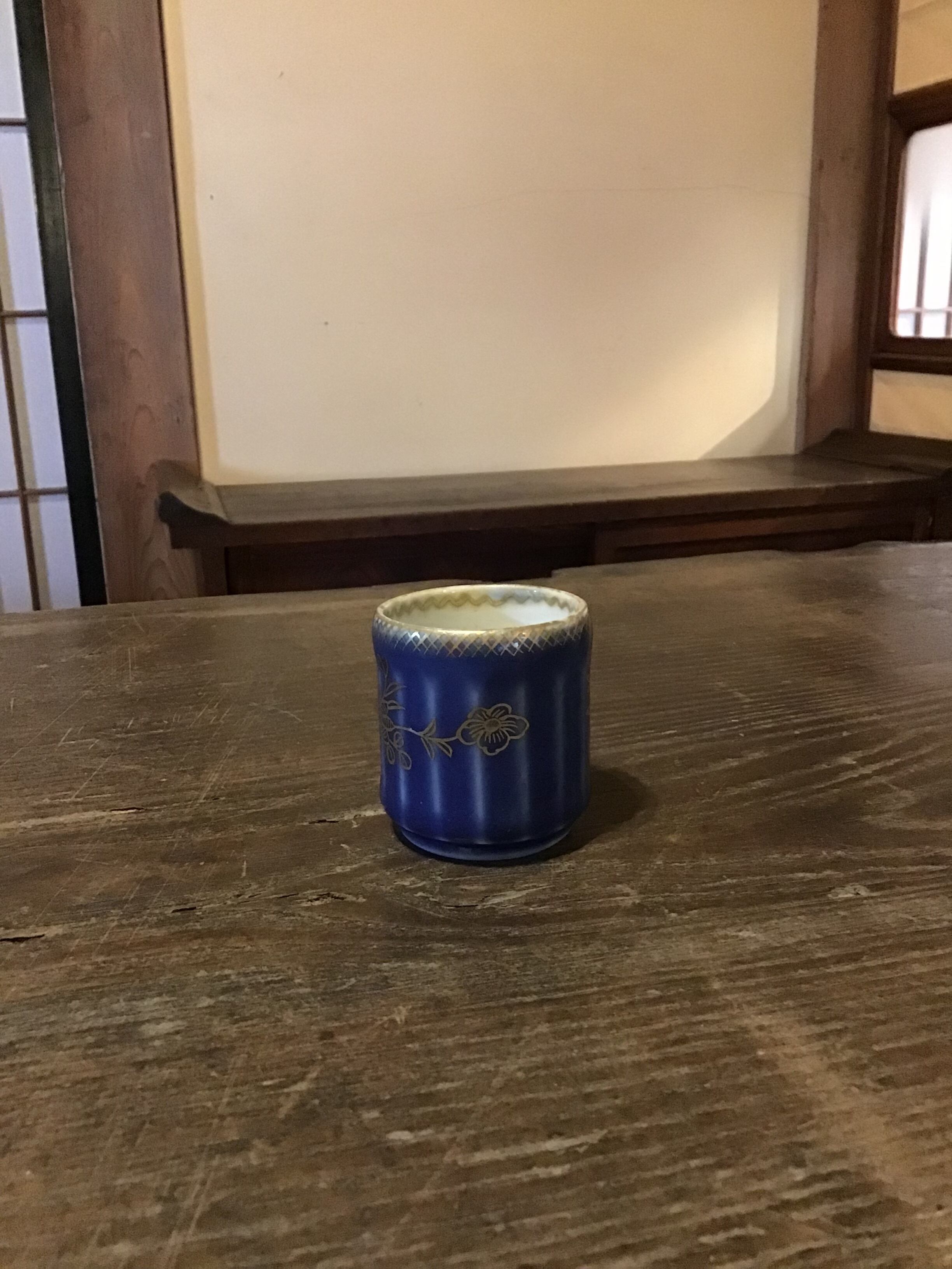 江戸時代後期、古伊万里のぞき猪口です。ご覧頂いて分かる様に、少し厚手に挽いた胴部に鎬が施されています。古伊万里の猪口類においてボディをいじる事は焼成にリスクが生じるため行わないのが常識と思われますが、新たな試みなのか、よほど上手なのか。鎬の凹凸によって瑠璃釉に濃淡が生じこれも計算された意匠と言えるのでしょう。金彩を定着させるため再度低温で焼かれております。こう考えてもかなり上手のお品と考察します。手取りよく酒呑に最高です。